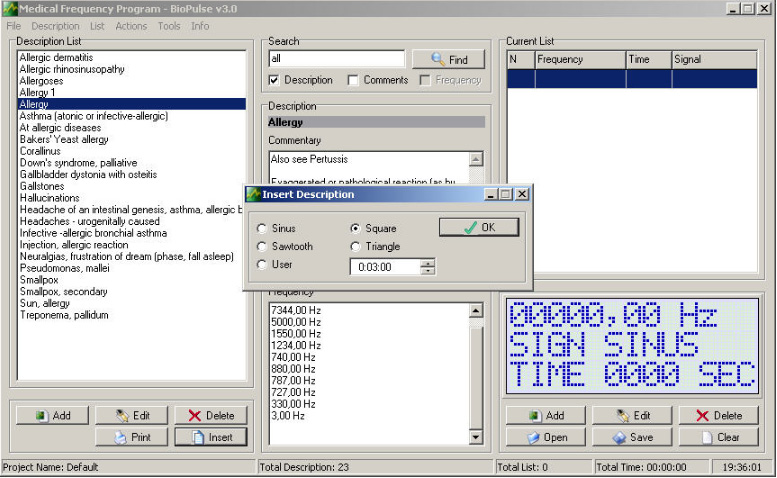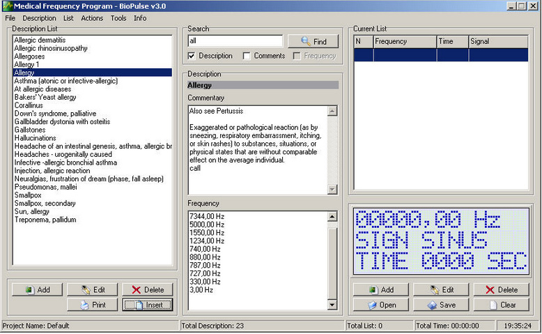 Программное обеспечение позволяет искать заболевания ключевое слово в его названии (описание), комментарии или если вы помните, частоты , связанного с данным заболеванием. Вы можете распечатать частот, которые вы используете и комментарии к ним.