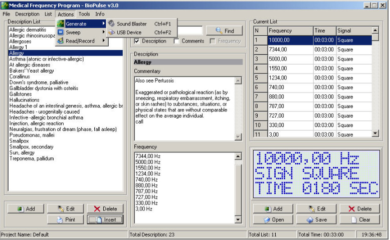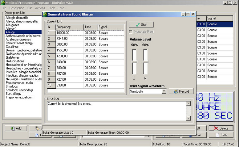 Программа может работать независимо от звуковой карты или с устройством, которое поддерживает амплитудно-частотная терапия также. Перечень заболеваний, содержит около 1962 имен. Вы можете выбрать их из списка и сохранить их на устройство для генерации.