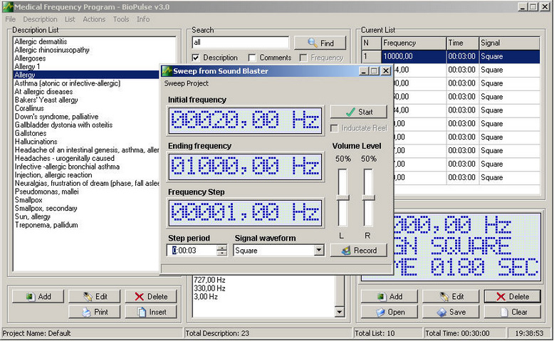 Программного обеспечения - Biopulse v.3.0 может быть две модификации. Первый вариант работает без какого-либо устройства только с использованием звуковой карты в компьютере. Диапазон частот: 20 Гц - 20000 Гц Шаг частот: 0,01 Гц. Лист заболеваний примерно 1600 болезней.