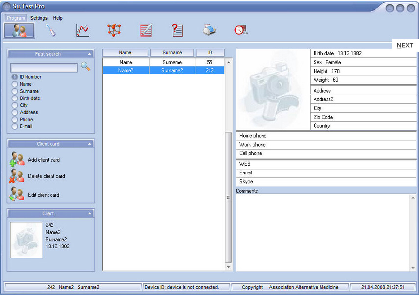 Программа обеспечивает полноценную работу с картотекой пациентов: создание/удаление, просмотр, редактирование и поиск карточек пациентов по имени, фамилии, дате тестирования и прочим параметрам. Возможно сохранение неограниченного количества пациентов и результатов тестирования в базе данных. Программа отображает результаты измерений в различных графиках: круговая диаграмма, традиционный график 12 меридианов, график меридианов по правой и левой стороне, сплит-меридианы - различие показателей одного и того же меридиана при повторных замерах.