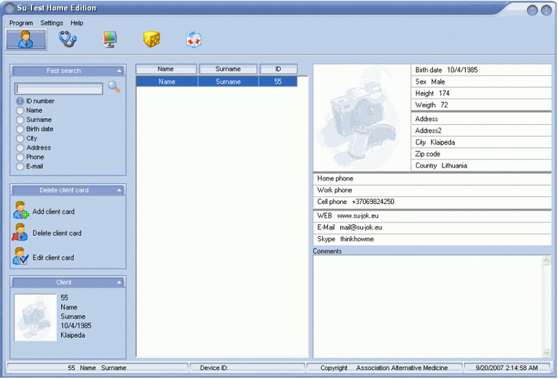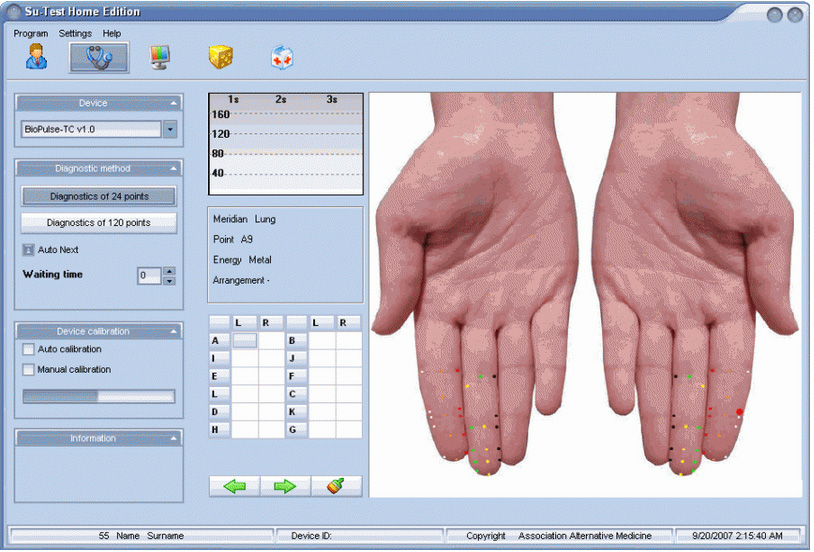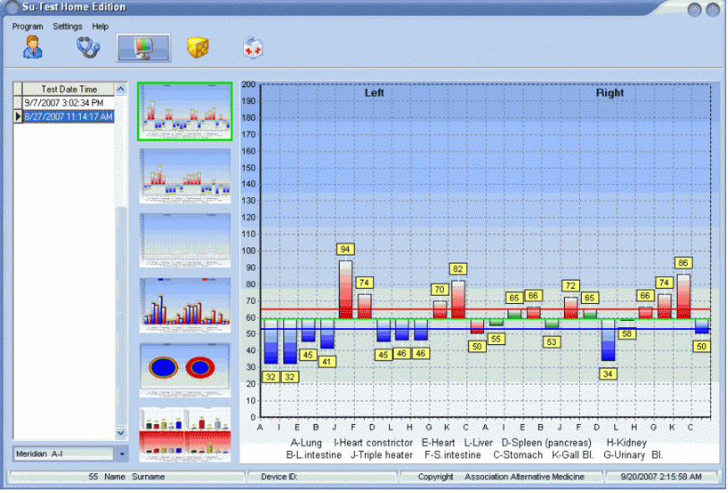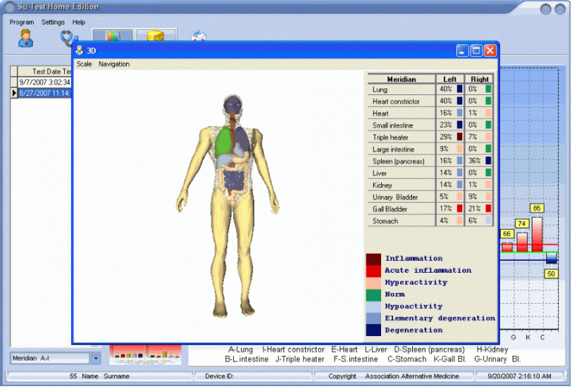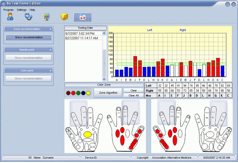 The software Su-Test Home edition is supposed for easy home use. It has the possibility to test 24 or 120 acupuncture points. You can view visually a graph on each measured point and after completion of all 24 points examination, the software graphs a complete meridians chart. The software enables a user to view imbalances in 3D model, female or male. Every organ is marked with a corresponding color depending on disorder severity. Su-Test Home editional helps to analyze a practitioner the most imbalanced Yin and Yang channels and shows then the most imbalanced organ on the corresponding system of palm, where it is necessary to find painful points and massage them.