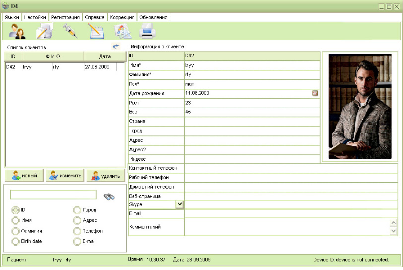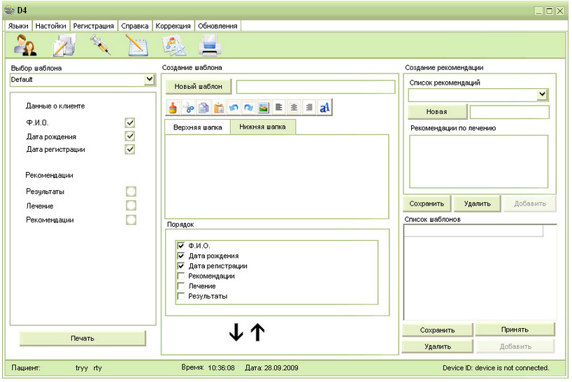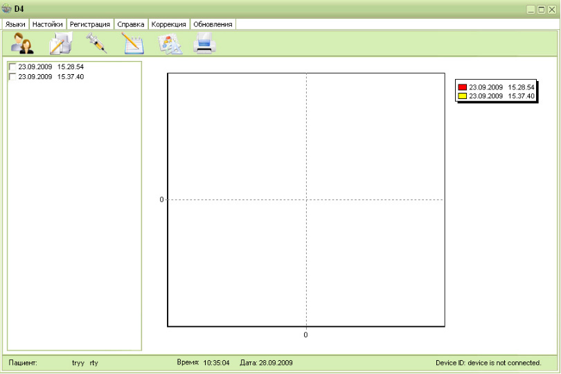Программа обеспечивает полноценную работу с картотекой пациентов: создание/удаление, просмотр, редактирование и поиск карточек пациентов по имени, фамилии, дате тестирования и прочим параметрам. Возможно сохранение неограниченного количества пациентов и результатов тестирования в базе данных. Программа позволяет сравнивать графики различных тестирований одного и того пациента для отслеживания и анализа результатов лечебного воздействия и динамики изменения состояния.