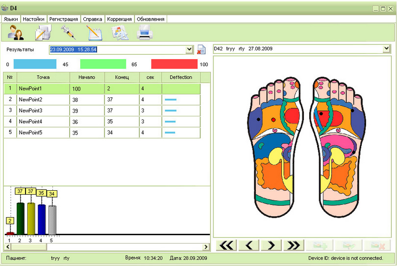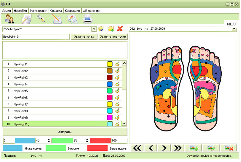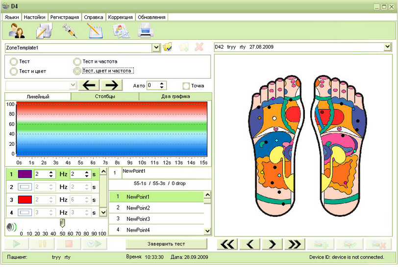 Программа позволяет осуществлять тестирование рефлексогенных зон кистей, стоп, ушных раковин, и других проекционных зон. Пользователь с помощью программы и диагностического щупа прибора снимает показания электропроводности с рефлексогенных зон и на основании полученных результатов, может судить о состоянии каждой зоны или точки.